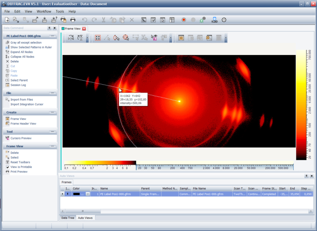 7)在DIFFRAC.EVA中,對(duì)塑料薄膜進(jìn)行WAXS測(cè)量分析。然后塑料纖維的擇優(yōu)取向便顯而易見了。