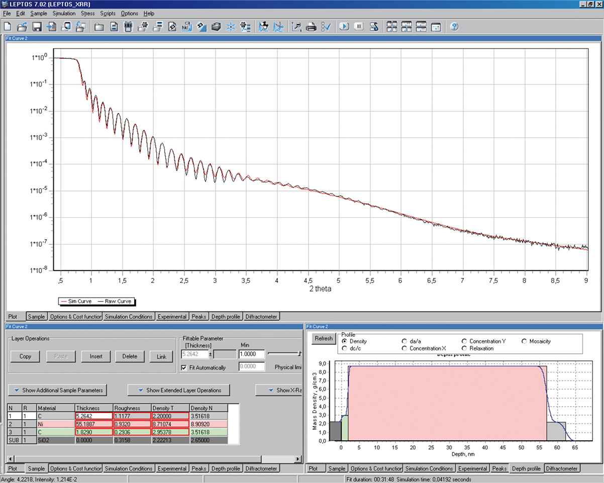 9)在DIFFRAC.LEPTOS中,對(duì)多層樣品的薄膜厚度、界面粗糙度和密度進(jìn)行XRR分析。