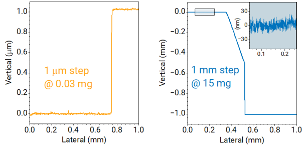 使用 Dektak Pro,一個測量頭可覆蓋 5 nm–1 mm 的步高和 0.03–15 mg 的負載(使用 N-Lite+ 選項),無需重新校準。低慣量傳感器 (LIS 3) 可快速適應表面地形的突然變化,并在動態測量場景中保持準確性和響應能力