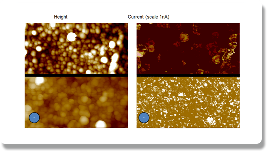 7)垂直站立碳納米管的電流分布成像。只有使用PeakForce TUNA模式才可能獲得該樣品的導電性分布。