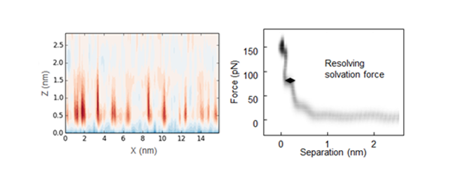 8)左圖:使用峰值力采集功能獲得的原子尺度下的力陣列圖像,清晰地揭示了垂直方向上的原子分布。右圖:使用峰值力采集功能獲得的平均力曲線結果顯示樣品表面的溶劑化結構。