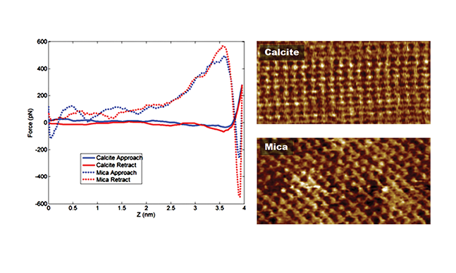 9)使用峰值力輕敲模式獲得的方解石和云母表面的原子尺度下的形貌圖像(右)和相應力曲線(左)