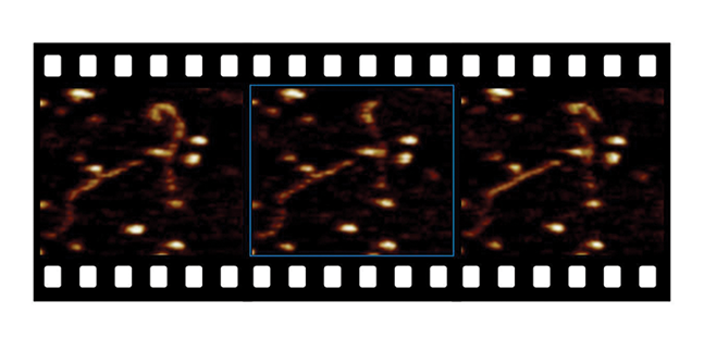 12)1秒,使用Dimension FastScan系統采集的液相中云母表面的DNA分子(通過APS方法制備)在1秒內的動態過程。樣本由內布拉斯加州大學的Y.柳布琴科提供。
