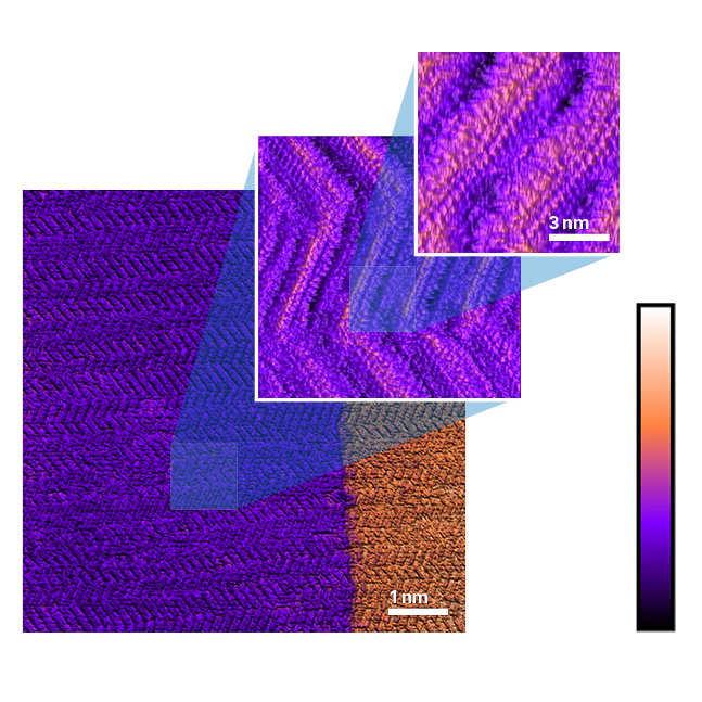 1)使用輕敲模式獲得的高定向裂解石墨表面甲醇聚集體的高分辨圖像。三幅圖像清晰顯示了間距為5nm的人字紋結構,其中間距為0.5 nm的精細周期結構也清晰可見。掃描范圍為250 nm,高度方向標尺為1nm。數據由貝德皮滕格博士提供。