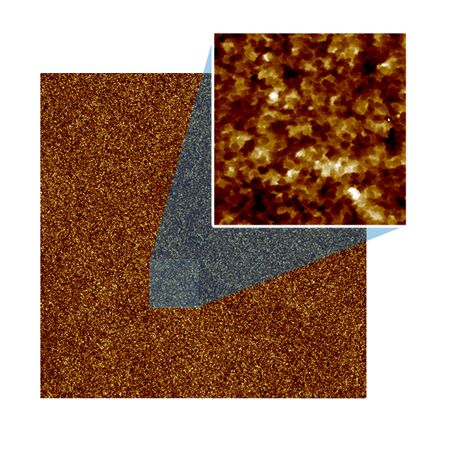 2)使用峰值力輕敲模式獲得的鋁硅酸鹽玻璃圖像,代表了工業樣品在空氣中成像的最高分辨率。保持尖的針尖是獲得高分辨的關鍵。針尖重構結構表明成像后針尖半徑仍為1 nm,說明在這個極具挑戰的堅硬表面上成像并未磨損針尖。成像范圍為5um, 5000x5000像素。峰值力設定值為600pN,使用的是FastScan B探針。數據由胡水清博士提供。