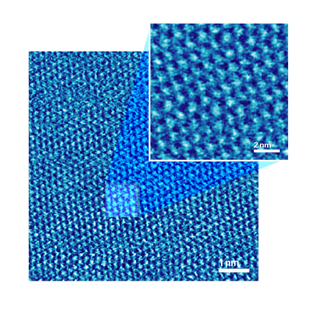 3)使用PeakForce TUNA模塊采集的高定向裂解石墨表面的電流分布圖,清晰顯示了石墨的原子晶格相,周期為0.25nm。過去要獲得如此高分辨的結果只能使用掃描隧道顯微鏡。所用探針為PF-TUNA,電流色標為60 pA,高度標尺為0.5mm。圖片由哈特穆特斯塔德勒博士提供。