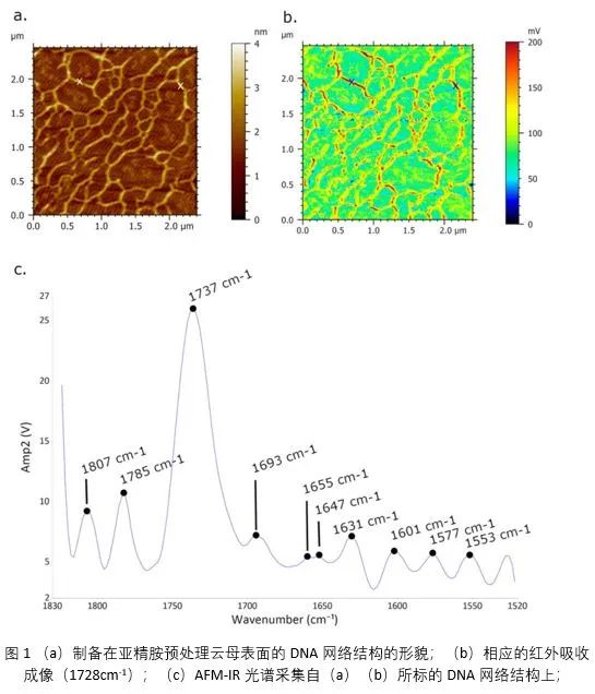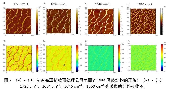 沉積在亞精胺官能化云母表面上的DNA分子呈現出多孔狀的DNA網絡結構,DNA分子相互吸引,但強度不足以產生完全球形的凝聚結構。圖1(b)為采用1728cm-1波數的紅外吸收對比成像,紅-黃色代表較強的吸收,綠-藍色代表吸收弱,紅外成像圖也清晰的展示出DNA的網絡結構。納米光譜(圖1c)顯示DNA分子上最強的吸收位于1700-1770cm-1,該寬吸收帶由雜環基的C=O、C=C和C=N基團的重疊面內振動組成。此外,峰值在1693 cm?1的特征光譜來自腺嘌呤;1647 cm?1和1655 cm?1處的吸收帶分別是胞嘧啶和酰胺I帶的C2=O2中等強度拉伸的標志;在1630 cm?1附近發現一個與胺基團相關的低強度峰;而峰值位于1577 cm?1的吸收帶與腺嘌呤的C=N振動拉伸有關。
