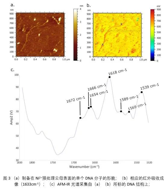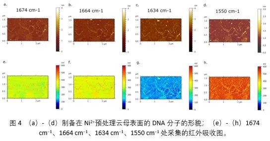 作者采用亞精胺和Ni2+預處理云母表面,隨后沉積DNA分子結構,采用納米紅外光譜技術分別對兩種DNA分子結構進行納米尺度化學表征。