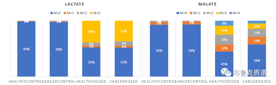 此外,SCiLS Lab還提供了API擴展功能接口,可以方便用戶進行更靈活的數據處理。在本文中,通過R語言將所有母離子以及碳同位素的強度信息提取出來,從而對腫瘤組織中TCA循環中代謝物進行定量分析。圖4為TCA循環中典型代謝物的離子熱圖,參與循環的蘋果酸等在腫瘤區域的空間表達顯著高于健康組織區域。圖5為在13C6-葡萄糖攝入后,乳酸和蘋果酸對應的代謝產物M+0、M+1、M+2、M+3和M+4的同位素相對強度比值;與健康組織相比,腫瘤組織中M+0的比例更高,而M+2、M+3和M+4的比例較低。結合上面兩部分數據,說明膠質瘤組織較健康區域TCA循環的活性發生顯著下調。